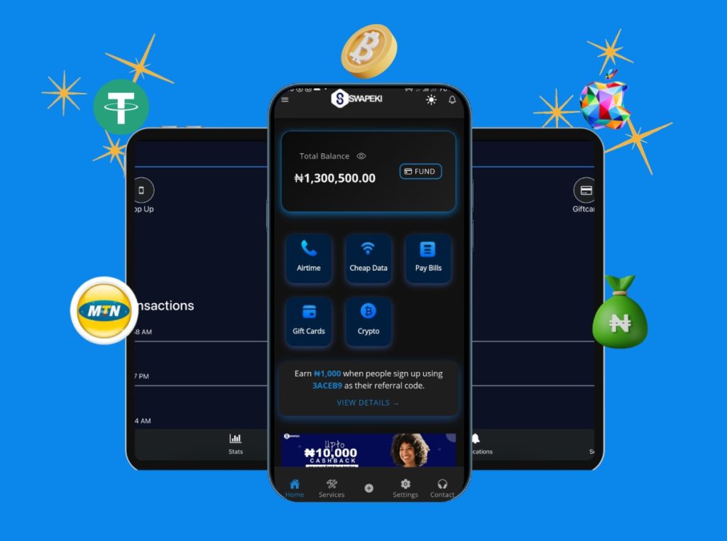 Swapeki is a platform that allows you to easily trade your Digital assets at the best rates to Naira. You can also Top up airtime, get Best Data offers, and pay bills like electricity and cable Tv.